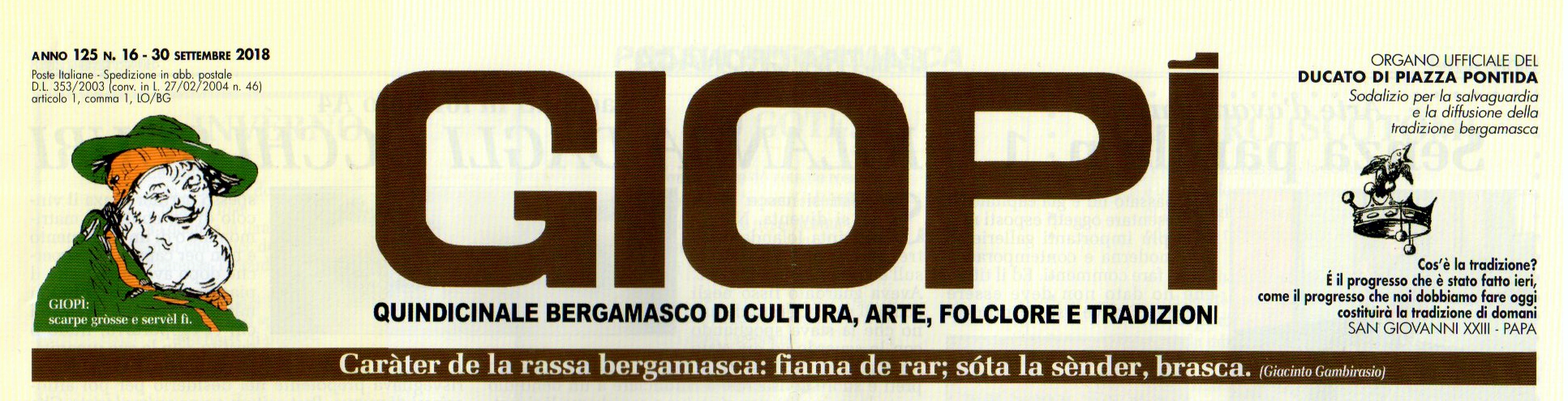 E con grande nostro piacere tale lavoro viene riconosciuto dalla redazione di una testata giornalistica tutta bergamasca che da più di mezzo secolo si preoccupa di tenere vive le tradizioni della nostra terra. Al nostro GIOPI’, organo ufficiale del Ducato di Piazza Pontida, che regolarmente ospita le nostre immagini corredate dalla traduzione in bergamasco, tanti auguri di lunga vita!