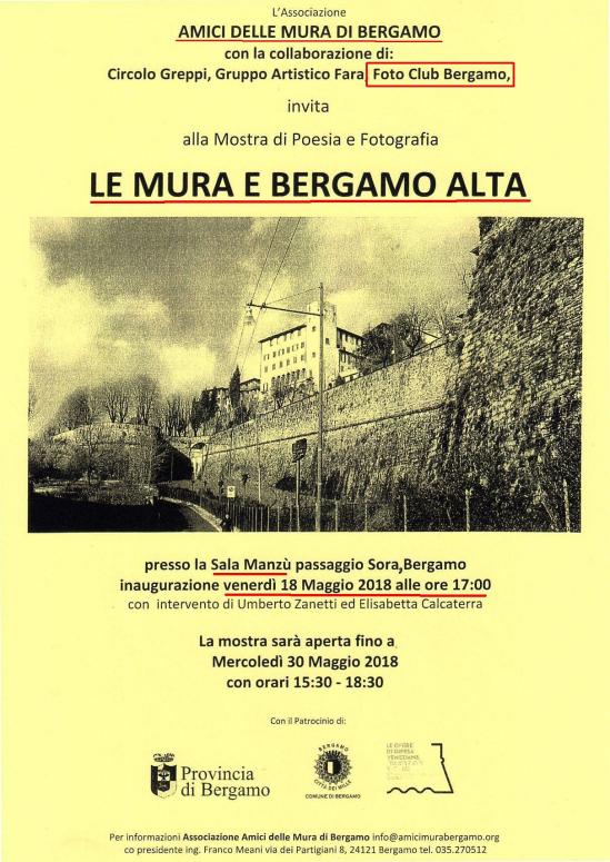 Nell’ambito delle iniziative per festeggiare i 40 anni di attività, il Club, questa volta in collaborazione con un’altra storica Associazione, “Gli Amici delle Mura di Bergamo” che compie quest’anno 20 anni dalla fondazione, organizza una mostra-rassegna fotografica di alcuni Soci che saranno felici di incontrarsi per l’occasione con amici e appassionati per interessanti scambi di idee.