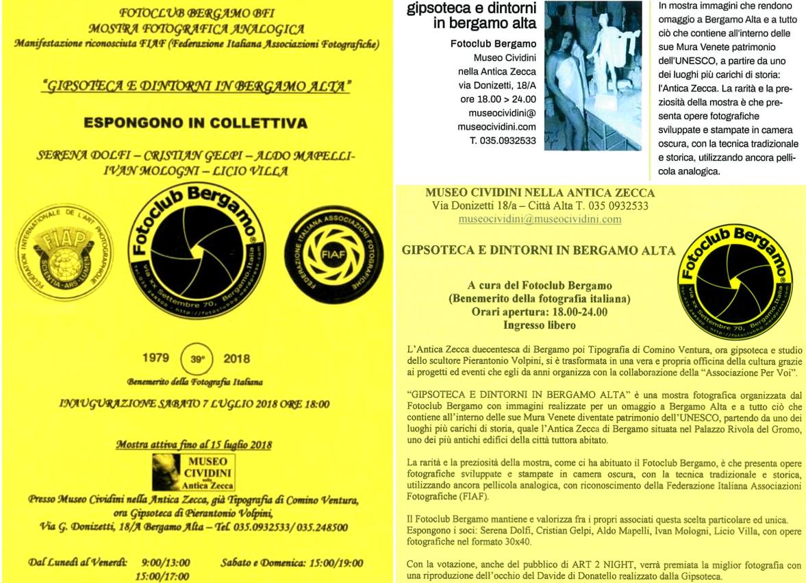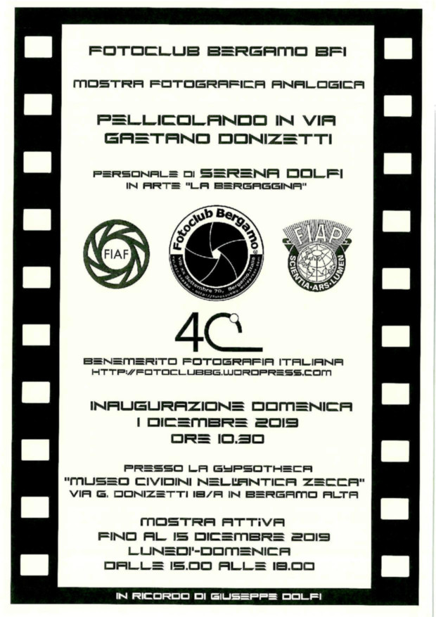La mostra di ben 45 soci su 100 selezionati da giuria interna ed esterna per esporre 45 opere fotografiche artistiche a pellicola su carta in gelatina ad alogenuri d’argento. Il prestigioso evento avrà luogo a Bergamo, in struttura adeguata e particolare.