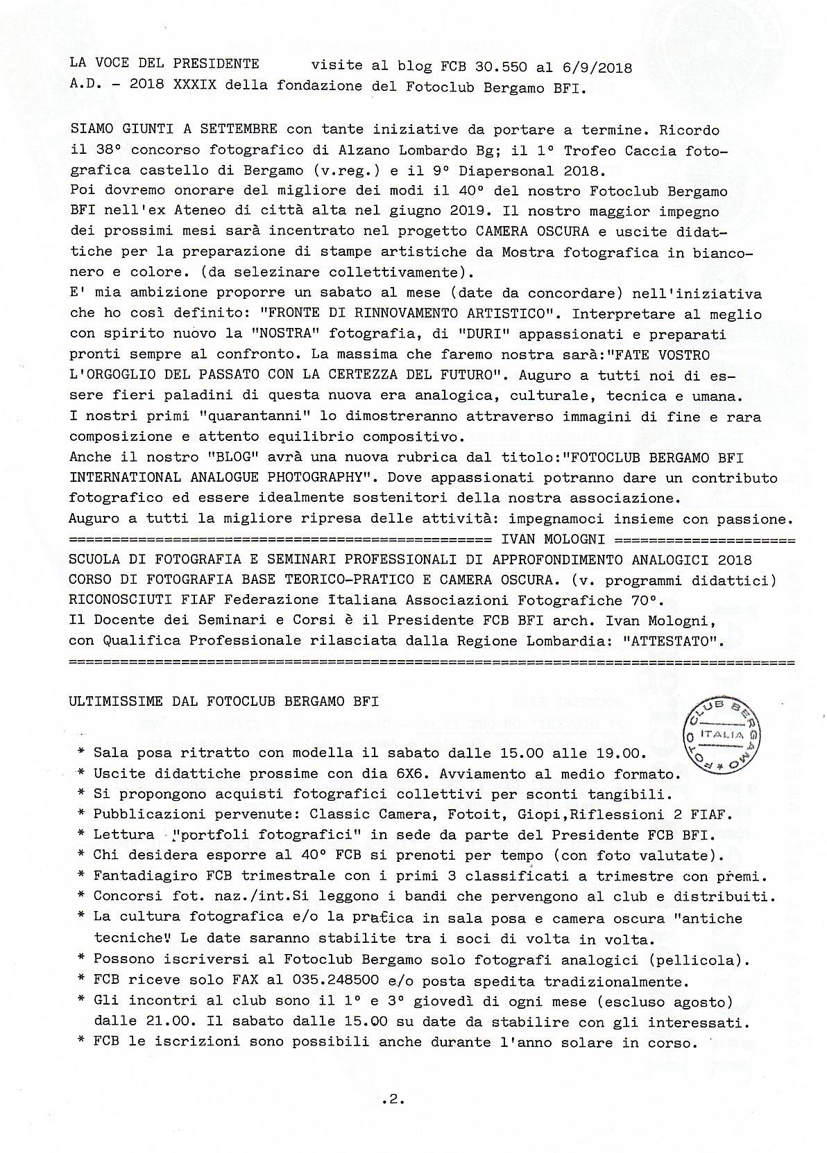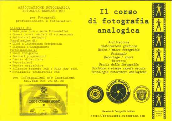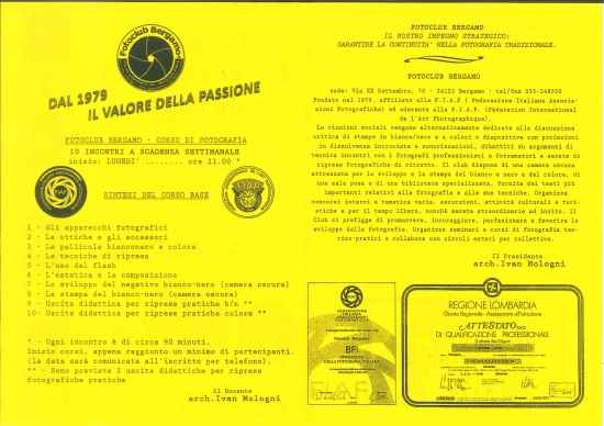 La docenza è curata dal Presidente del F.C.B. – Arch. Ivan Mologni con qualifica della Regione Lombardia – attestato per pellicole in bianco e nero, a colori e diapositive. I relativi sviluppi in Camera Obscura saranno effettuati sabato 23 marzo ore 15.00 (**).
