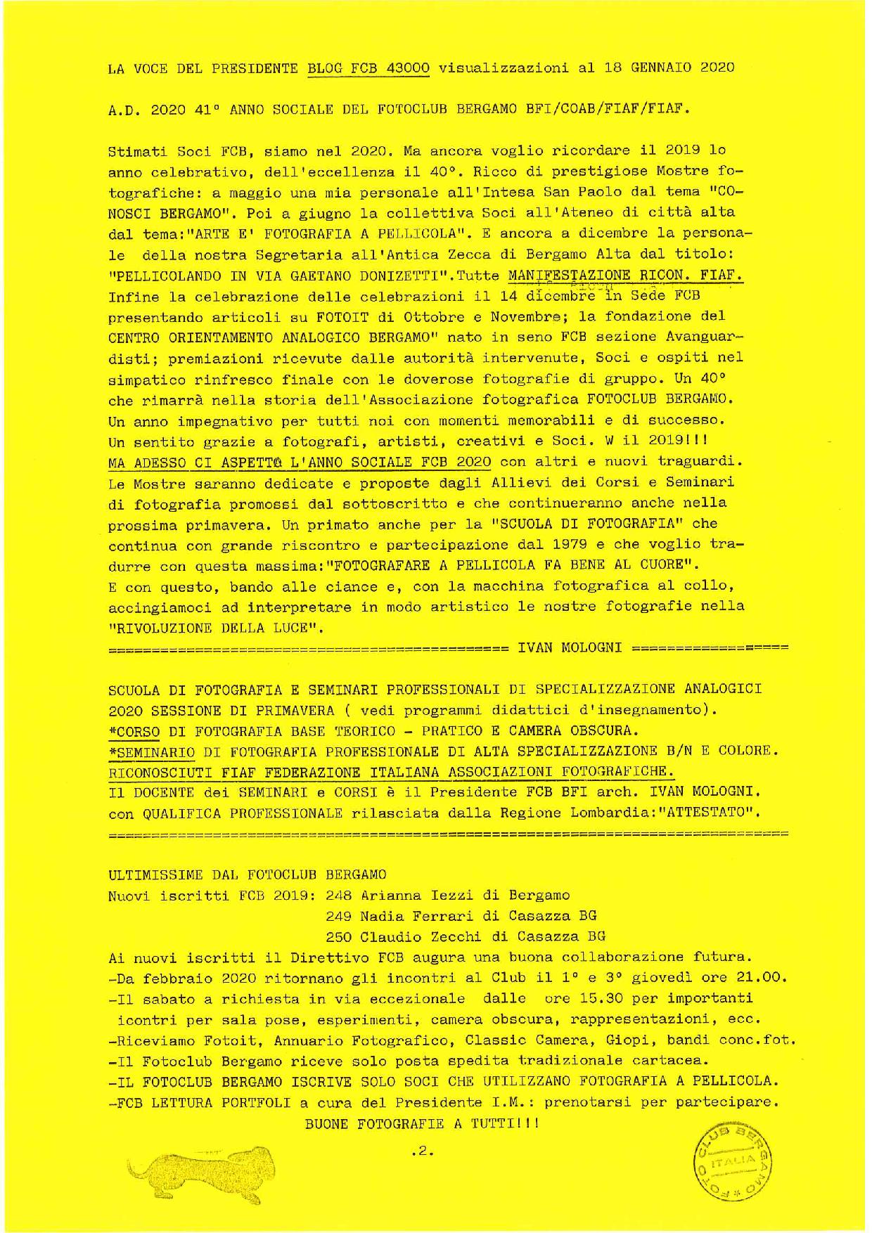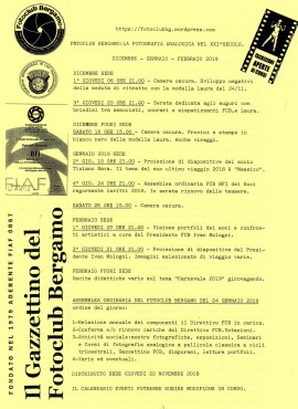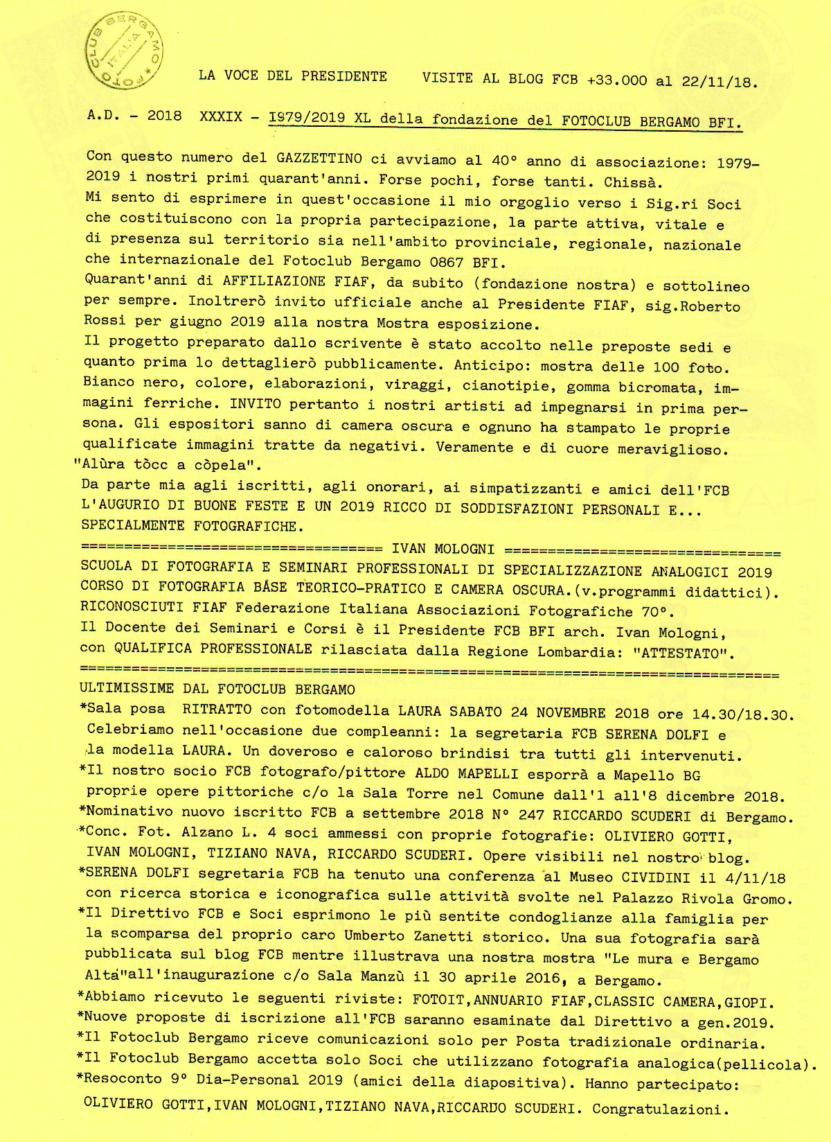 In appendice al nostro Gazzettino informativo trimestrale, vogliamo ricordare ai nostri associati che è stato eletto, alla gradita presenza di responsabili della Fiaf, il nuovo direttivo del Club, che resterà in carica per il prossimo triennio; riconfermato l’incarico di Presidente all’infaticabile Arch. Ivano Mologni, con la vice-presidenza di Licio Villa e con il Consigliere Tiziano Nava, per la prima volta nella storia del Circolo, la carica di Segretario è risultata affidata al gentil sesso nella persona di Serena Dolfi, cui auguriamo un proficuo impegno.