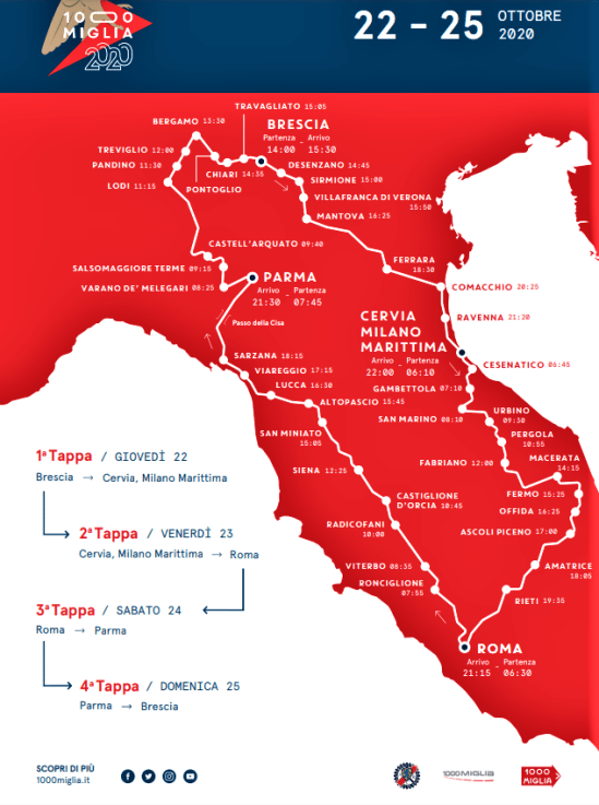 Per completezza e per chi fosse interessato a seguire la manifestazione, si riporta la mappa (tratta dal sitowww.1000miglia.it) con le principali tappe e i relativi orari di passaggio delle autovetture: