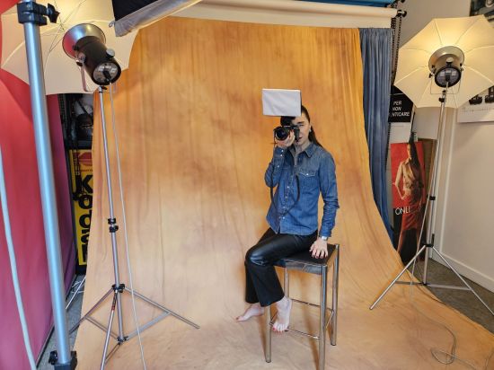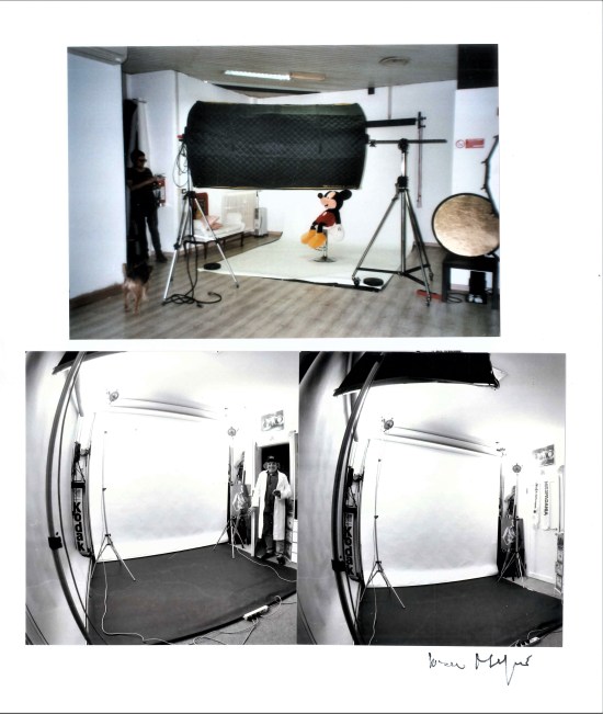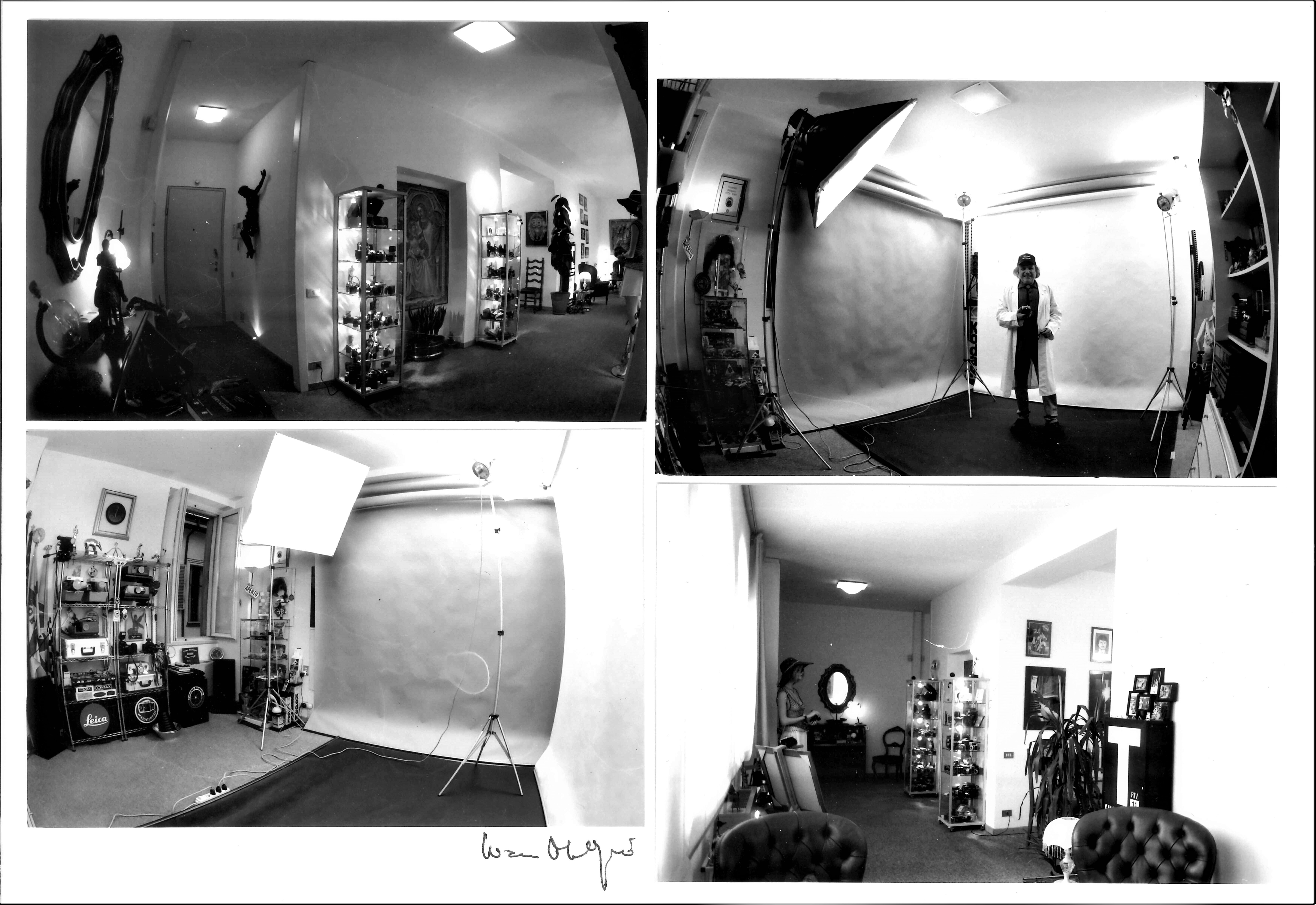 foto 1: sala pose con fondali in stoffa lastolite attrezzata per lo still-life;