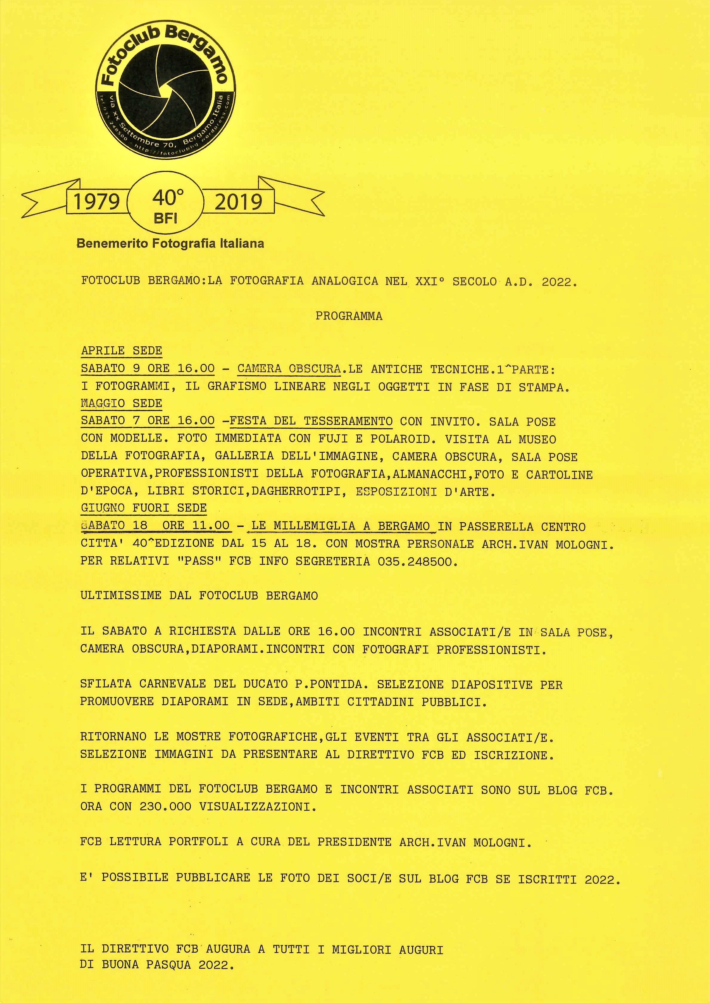 In occasione della mia mostra di fotografia analogica sulle “Millemiglia” al chiostro di Santa Marta in Bergamo (v. articoli Millemiglia 2022 – Inaugurazione presso il Chiostro di S.ta Marta in Bergamo – 17 giugno 2022 & Mostra personale di fotografia “Millemiglia”) è stato presentato il Nuovo Logo del Fotoclub Bergamo. La grafica è rimasta storica, risale al 1979 ed è il frutto di un mio studio che rappresenta il diaframma di un obiettivo chiuso a F 22. Rispetto alla versione precedente sono stati aggiunti i riferimenti del nostro “sito”: http://www.fotoclubbergamo.com e il fondo è giallo-corsa invece del bianco, come il nostro motto: sempre in corsa per scatti colti al volo!