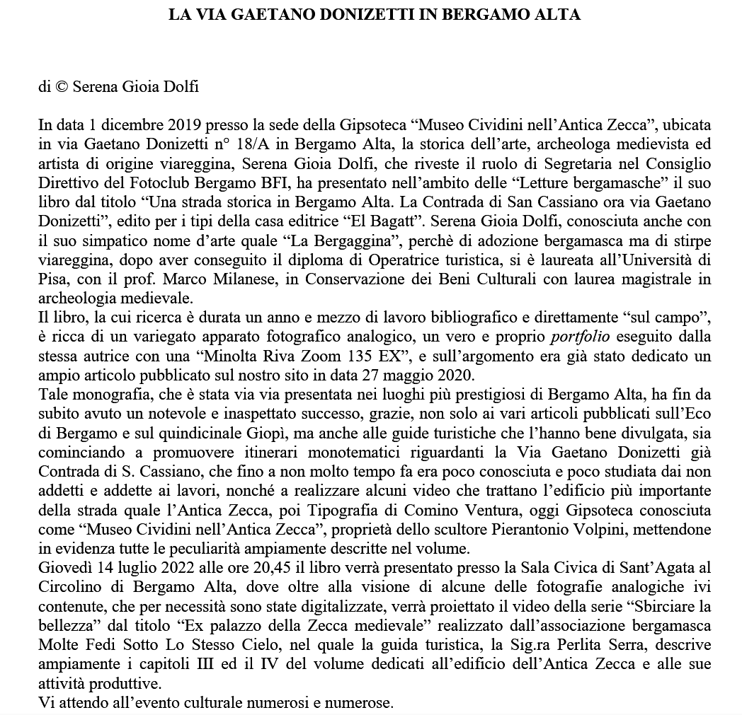 Una proposta quindi di incontro in occasione della inaugurazione che si terrà SABATO 1 GIUGNO P.V. alle ore 17.00 presso la Sala Ateneo in P.zza Giuliani in Città Alta.