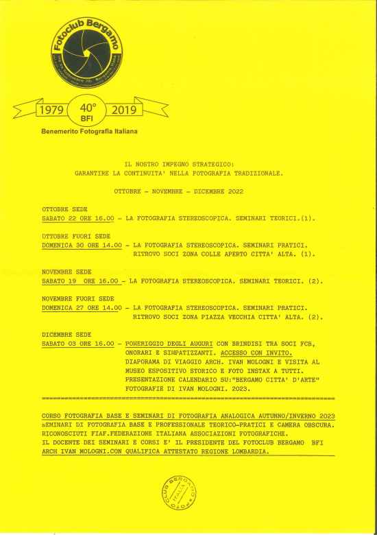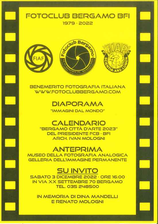 Una succosa anticipazione: sabato 2 dicembre 2023 alle ore 16 è stata programmata la “Festa del Tesseramento al Fotoclub Bergamo“: il 100° iscritto riceverà la speciale tessera “Gold 2023“. Verranno altresì distribuite fotografie storiche per estrazione, a turni di 25 visitatori ogni ora (per questione di spazio). Seguirà rinfresco e auguri di fine anno (verrà pubblicato in seguito programma di dettaglio).