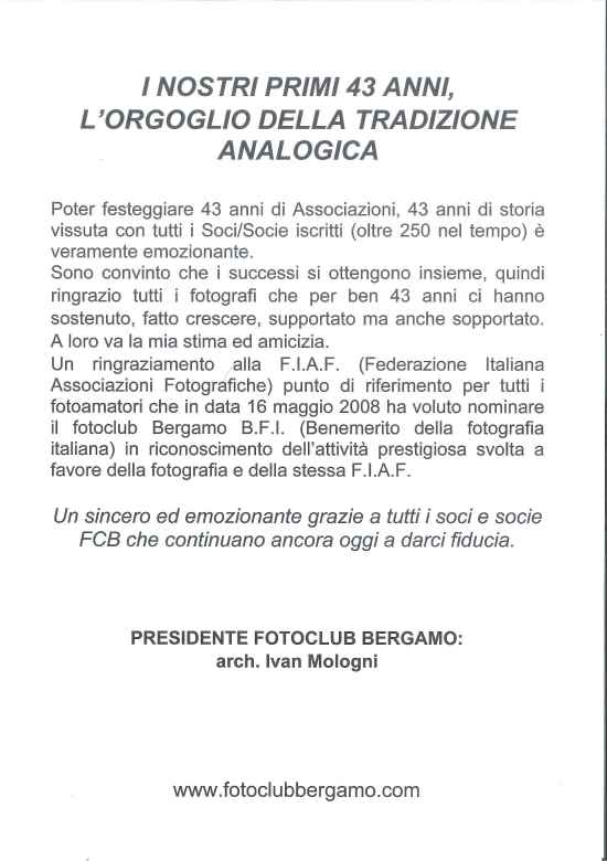 Presenti il Direttivo FCB al completo: Presidente Ivan Mologni, Vicepresidente Licio Villa, La segretaria Serena Dolfi, soci FCB ed autorità. Presenti Miss e Mister. Presentati l’articolo su Fotoit, il calendario 40° FCB, il logo del Centro Organizzato Analogico Bergamo nato in seno al Fotoclub Bergamo sezione Bergamo. Successivamente si concludeva il tutto con simpatico rinfresco, brindisi, autografi per altri 40 ANNI di Associazione FCB. Il Presidente Arch. Ivan Mologni