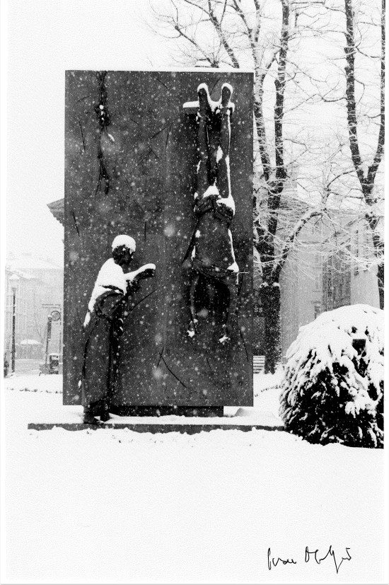 In Città bassa, nel centro “piacentiniano” (dal riordino del centro città che si riferisce all’Arch. Piacentini) si trova il “Monumento al Partigiano” (durante l’ultima nevicata del dicembre 2020). Ho voluto fotografare queste sculture “materiche” con pellicola bianco e nero, poiché la lettura non deve essere distratta dall’elemento colore.