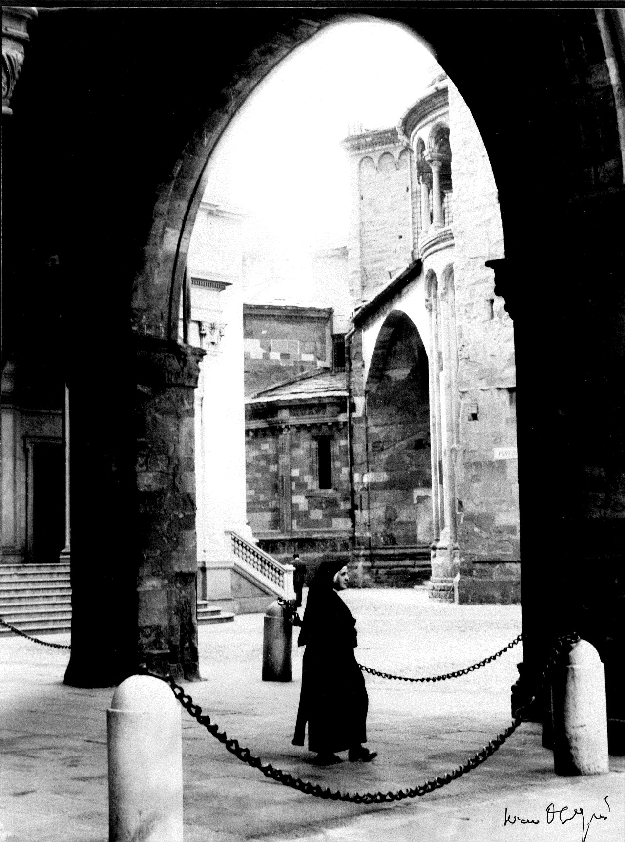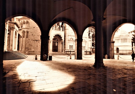 Dati tecnici: sviluppo negativo Kodak Tri-X da 400 Iso in D 76, diluizione 1+1 a 20°, con trattamento in tank Paterson (agitazione ogni 30”). Stampe su carta Agfa Gradazione 3 lucida. Il viraggio di una foto (portici Palazzo della Ragione) in seppia (con foto chimica Ornano).