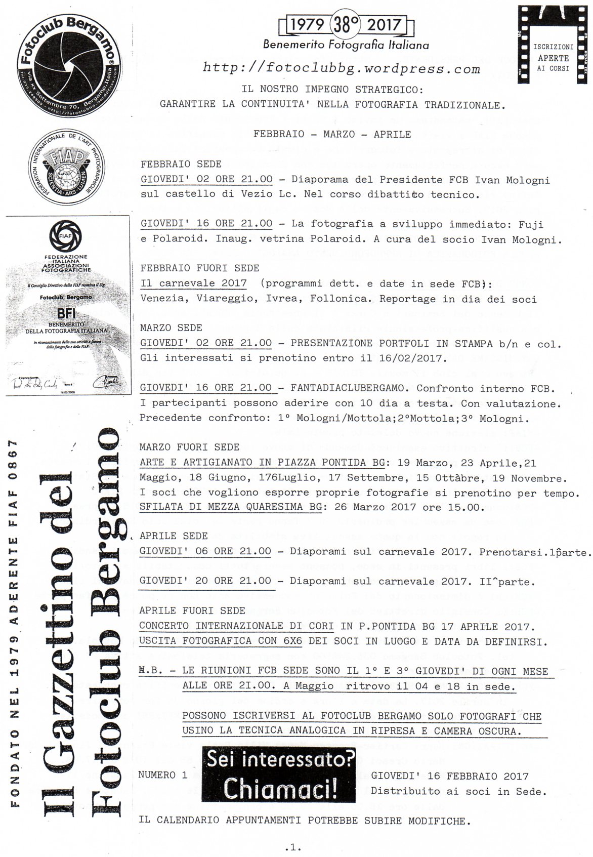 Gazzettino del Foto Club Bergamo dal 1979 – n° 160 (!) pubblicazioni: F.C.B. edita il proprio trimestrale. Il Direttore responsabile è l’Arch. Ivan Mologni. Il Comitato di Redazione è costituito dagli associati FCB in regola con il tesseramento annuale