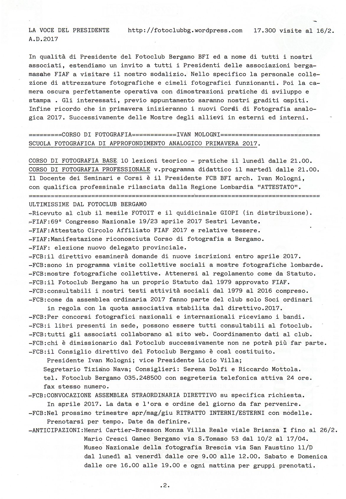 In appendice al nostro Gazzettino informativo trimestrale, vogliamo ricordare ai nostri associati che è stato eletto, alla gradita presenza di responsabili della Fiaf, il nuovo direttivo del Club, che resterà in carica per il prossimo triennio; riconfermato l’incarico di Presidente all’infaticabile Arch. Ivano Mologni, con la vice-presidenza di Licio Villa e con il Consigliere Tiziano Nava, per la prima volta nella storia del Circolo, la carica di Segretario è risultata affidata al gentil sesso nella persona di Serena Dolfi, cui auguriamo un proficuo impegno.
