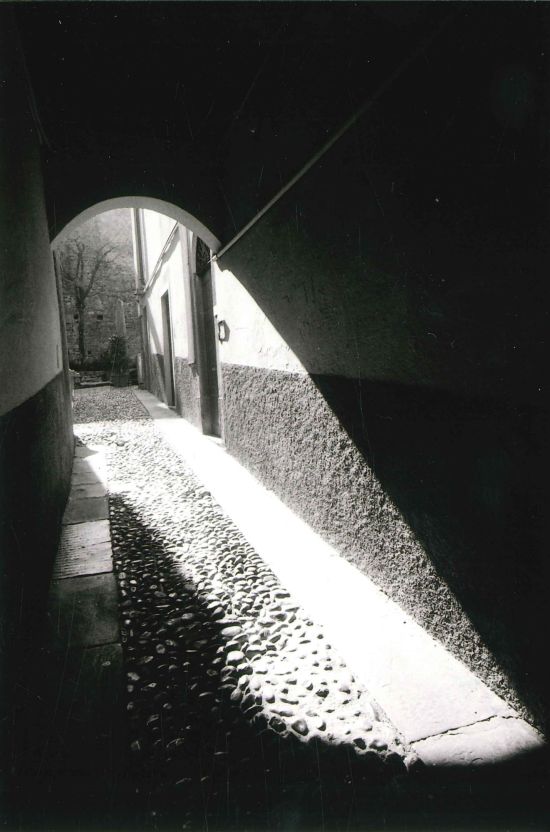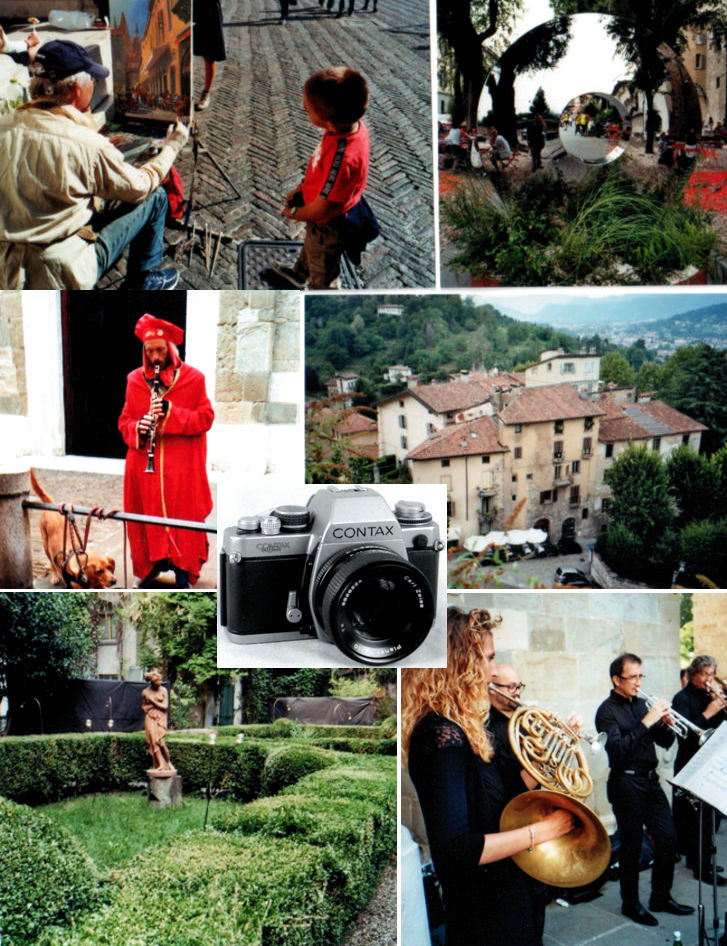 La proposta per una uscita di studio con allievi era l’utilizzo di una gloriosa macchina fotografica e ottenere immagini particolari della nostra splendida alta città. La scelta è caduta sulla Contax S2 della speciale edizione per il 60° anniversario; macchina meccanica con esposimetro incorporato a lettura nel mirino spot. Non comuni i personaggi incontrati nel percorso né il paesaggio ripreso dallo spalto del chiostro di San Francesco, nel quale è attivo da novembre il museo permanente di foto e attrezzature fotografiche analogiche.