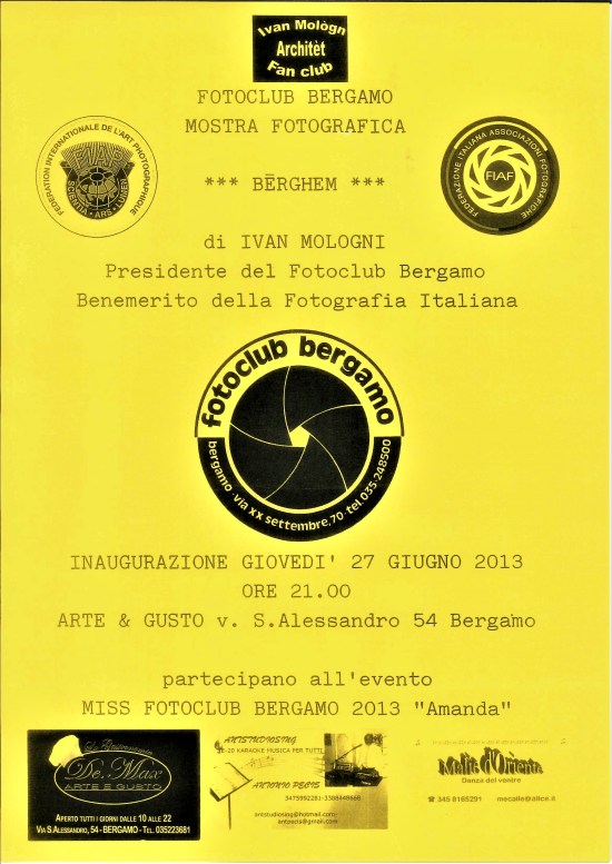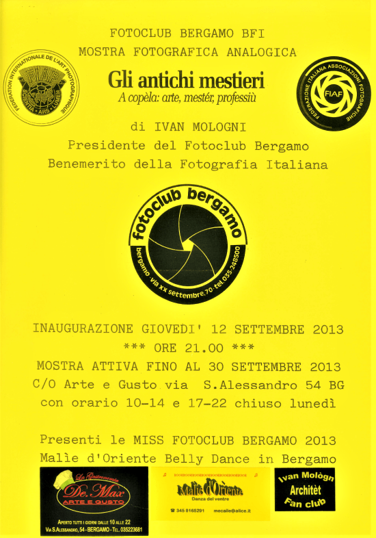 Oltre al libro, ho presentato due Mostre Personali nel settembre del 2013 presso “Arte e Gusto” in via S. Alessandro 54 a Bergamo, con la presenza di tutte le “Miss Fotoclub Bergamo” e le “Malìe d’Oriente Belly Dance” di Bergamo.