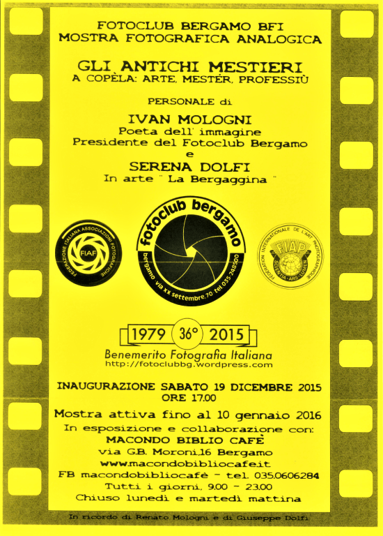 L’altra Mostra Fotografica si è tenuta presso il “Macondo Biblio Café” di via G.B. Moroni nr. 16 a Bergamo. Qui esponevo insieme alla Segretaria del F.C.B. – Serena Dolfi – in arte la “Bergaggina“. Nell’occasione ho selezionato 30 opere nel formato 30 x 40 in bianco e nero, da me stampate in Camera Obscura.