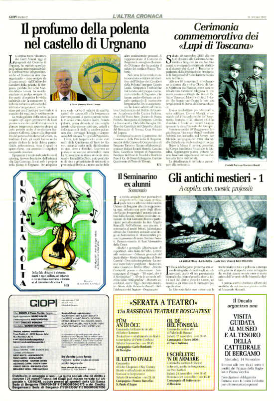 Ho proposto questa mia ricerca al quindicinale bergamasco di cultura e folklore “Giopì“: dal 31 ottobre 2012 collaboro con il Comitato di Redazione del giornale. Con il 2019, il mio impegno si può dire concluso.