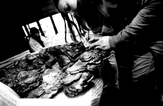 In questo caso ho usato come attrezzatura di ripresa due corpi Contax G2 a telemetro, poichè lo scatto che producono è più “ovattato” (l’otturatore è centrale, senza lo specchio che “sbatte” come nelle Reflex). Gli obiettivi sono tutti Carl Zeiss: 21mm, 35/70mm e 90 mm. Le macchine erano “cuffiate” cioè in custodia per attenuare qualsiasi rumore. La pellicola è una kodak TMax 3200 Iso. Sviluppo e stampa effettuati dal sottoscritto.