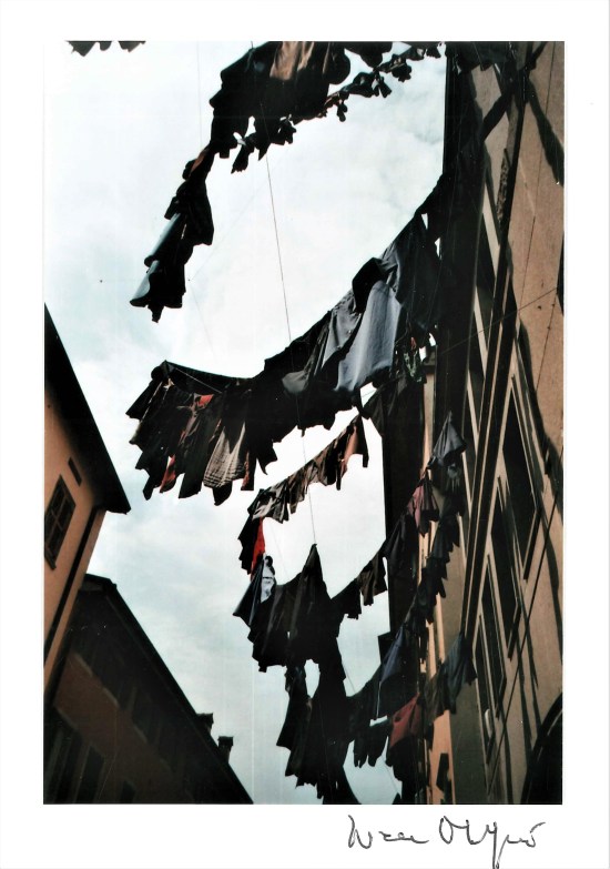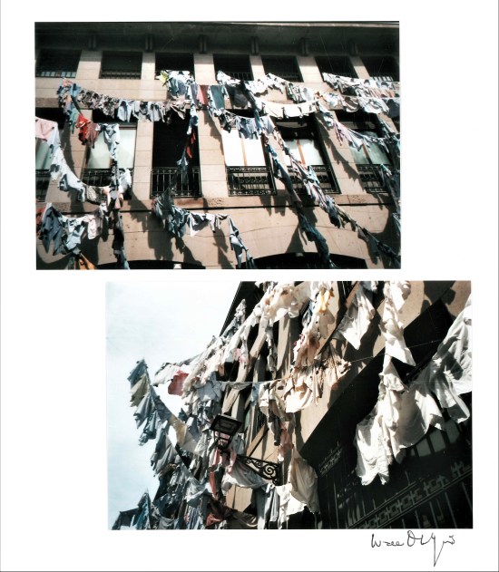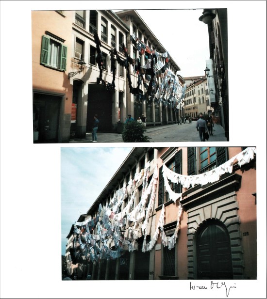 Gli abiti diventano frammenti di esistenza e reliquie di storia quotidiana che, come tasselli di un mosaico corale, compongono, legandosi e stratificandosi, una narrazione in continuo dialogo con la vita della città che, imperterrita, continua a scorrere per la via, tra i palazzi del centro.