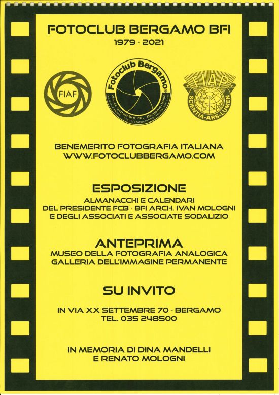 Per l’occasione il Fotoclub Bergamo BFI espone, presso la propria sede in via XX Settembre n. 70, scatti fotografici e un calendario realizzato dal proprio Presidente, Arch. Ivan Mologni.