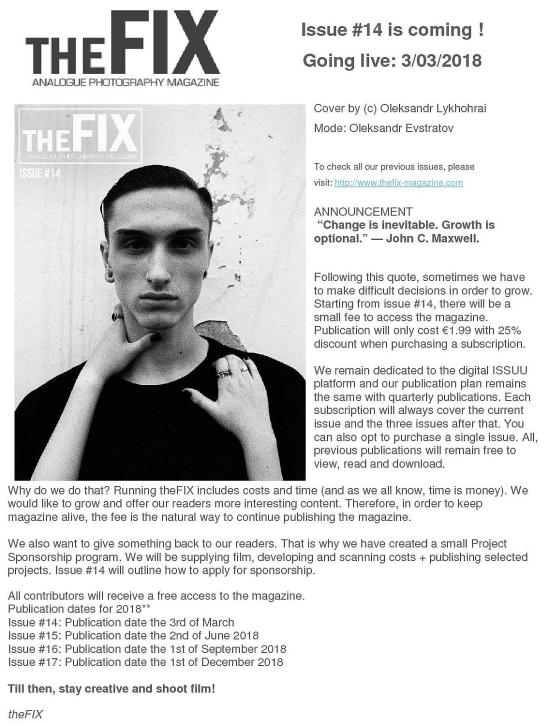 – Il sottotitolo : Fotografi di Moda: Ritorna la pellicola. In un’epoca di immagini digitali onnipresenti, diversi fotografi di moda, emergenti ma già in rapida affermazione, hanno utilizzato per le loro riprese la pellicola analogica e ciò per differenziare il loro lavoro, recuperare il controllo del loro mestiere e trovare un ritmo più umano.