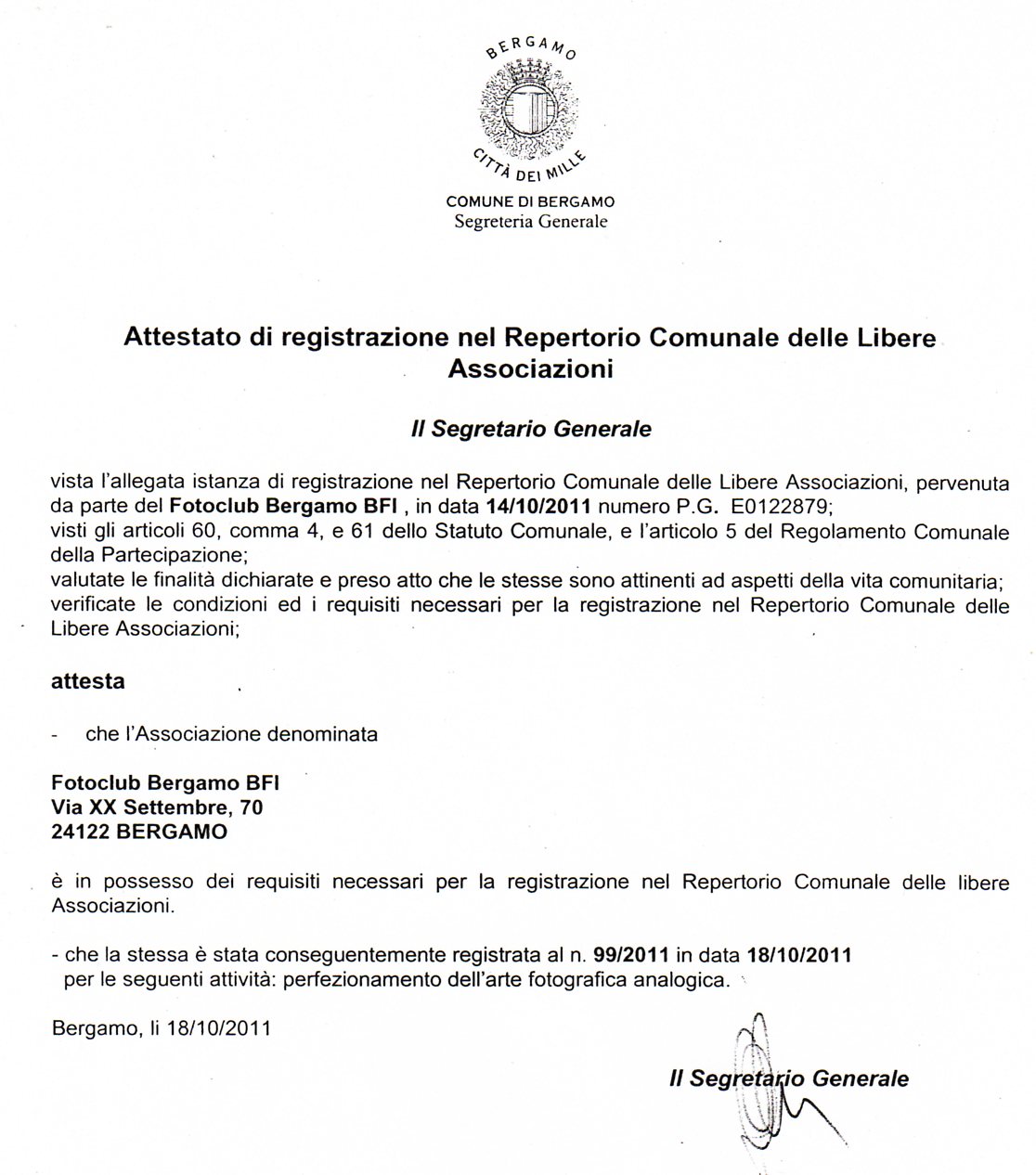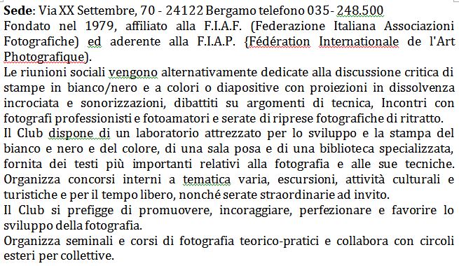 vedi lo STATUTO DEL FOTOCLUB BERGAMO e l’Appendice relativa a Mostre