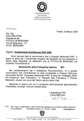 Il Foto Club Bergamo, anche per il 2020, aggiunge alla sua pluridecennale collezione l’attestato di affiliazione alla F.I.A.F.: