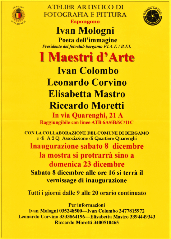 Ribadiamo che la presente esposizione sarà visitabile presso la sede del Fotoclub Bergamo per tutto il mese di dicembre 2021 e gennaio 2022 solo ed esclusivamente su appuntamento ed in osservanza delle normative sanitarie anti-covid in vigore.