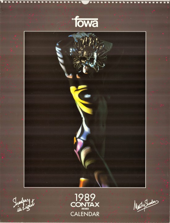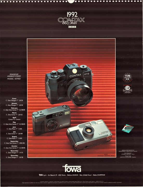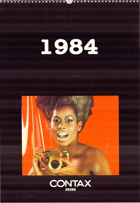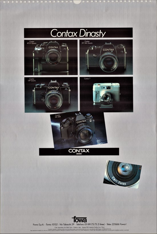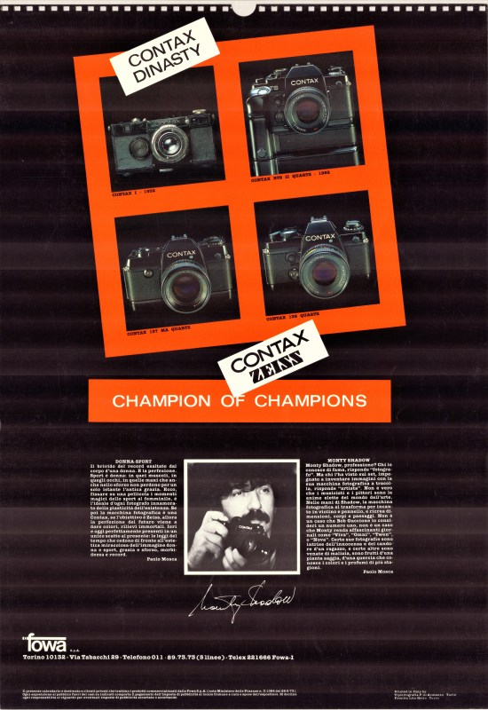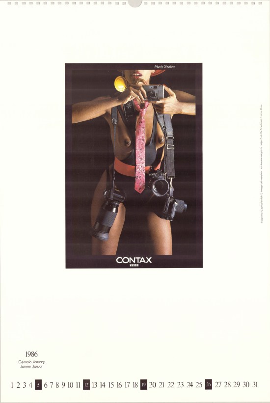 Mi voglio dapprima soffermare sul calendario 1984 del grande fotografo Monty Shadow. Con sorpresa, in suo scatto con modella, appare come testimonial la Contax RTS Gold del 50° (nr. E 41) con obiettivo Planar 50mm f/1.4 (nr. 6059276), acquistata dallo scrivente (con garanzia Fowa) nel 2006. Proprio così: è lo stesso gioiello che custodisco come un “oracolo” nella mia vetrina personale. Una simpatica e unica coincidenza!