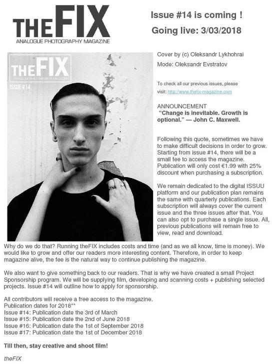 E’ di casa a Dublino, pubblica la rivista in digitale ma la sua presentazione è: “FIX, la rivista della fotografia analogica, creata per tutti quei fotografi che si divertono nell’usare la pellicola. FIX è stata fatta per ispirare, supportare e promuovere la fotografia analogica“.