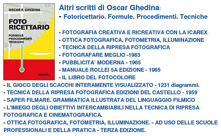 Rimane un mistero la vita sicuramente molto movimentata di Oscar Ghedina! E’stato un grande chimico, fotografo, alpinista ed editore cortinese di cui anche oggi, incredibilmente, non si trova in rete una biografia. Personaggio particolare che evidentemente svolgeva la sua attività e sapeva trasmettere le sue esperienze come un bravissimo artigiano ma senza ricercare pubblicità e notorietà per sé. Oscar Ghedina ha contrassegnato sotto vari aspetti la fotografia italiana -specie di montagna- del XX° secolo, lasciandoci in eredità un buon numero di libri interessanti che rivelano la sua sete di conoscenza e anche il suo desiderio di “far crescere” i suoi lettori.