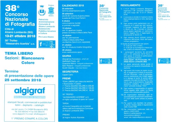 Si era concluso a Ottobre un altro importante appuntamento autunnale, a livello nazionale, per gli appassionati di fotografia: il Concorso Nazionale di Fotografia che si svolge ad Alzano Lombardo, presso il FotoClub Fantoni con il patrocinio del Comune, e giunto quest’anno alla sua 38° edizione. Di ottimo livello e sempre molto ben partecipato, il concorso era come sempre diviso in due sezioni (b/n e colori) a tema libero, al quale ogni fotoamatore ha potuto partecipare con un massimo di 4 stampe di formato 30×40; e, come sempre, anche alcuni Soci del nostro Fotoclub non hanno voluto mancare a questo incontro presentando vari lavori tra i quali :