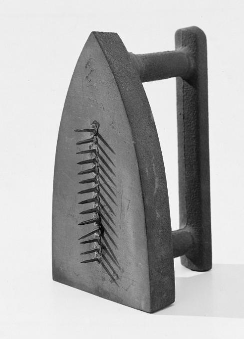 Del 1921, Cadeau. Nel 1922 Man Ray produce i primi fotogrammi, che chiama ‘rayographs’ che sono immagini fotografiche ottenute poggiando oggetti direttamente sulla carta sensibile da lui scoperte per puro caso. Mentre sviluppava in camera oscura, un foglio di carta vergine, accidentalmente, finì in mezzo agli altri e, dato che continuava a non comparirvi nulla, poggiò, piuttosto irritato, una serie di oggetti di vetro sul foglio ancora a mollo e accese la luce. L’artista ottenne così delle immagini deformate, quasi in rilievo sul fondo nero, che evoca il disegno luminoso.